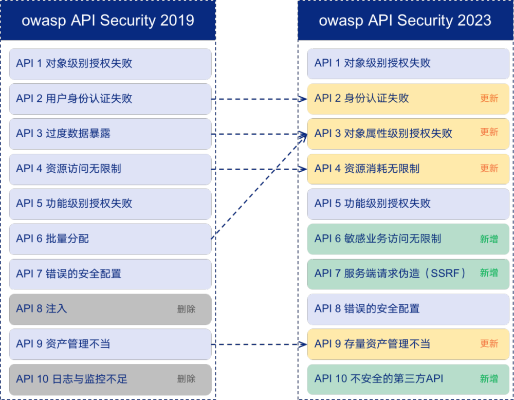 该列表与 2019 年十大 API 安全风险相比有不少变化。人生就是搏z6尊龙来仔细探究一下2023年与2019年相比,OWASP API Top 10所呈现出的风险变化。