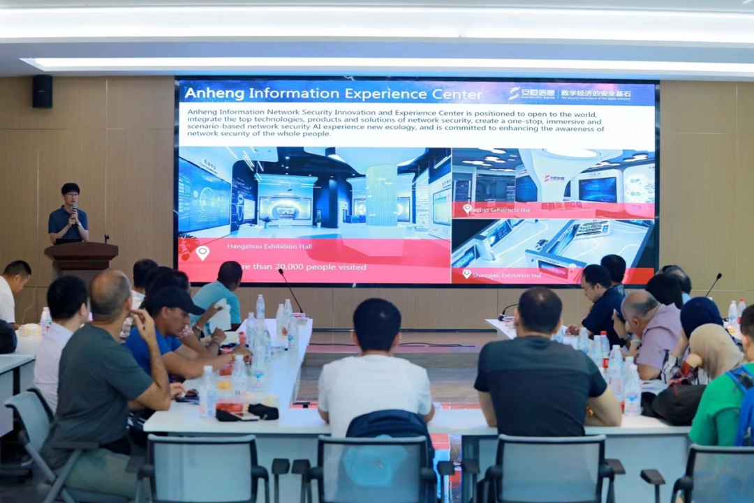 近日,区块链与信息安全技术交流研讨会在安恒信息西部总部成功举办。本次活动是商务部区块链与信息安全技术研修班项目活动组成部分,由上海亚太地区经济和信息化培训中心承办,在成都市大数据协会支持下,来自阿塞拜疆、古巴、加纳等11个国家28名代表,成都市大数据协会常务会长李跃, 上海亚太地区经济和信息化培训中心主任王根祥,安恒信息高级副总裁吴永越、段平霞,安恒信息四川分公司总经理、成都安恒信息公司总经理岳华龙出席会议。会议围绕安恒信息在网络安全领域的成果以及区块链安全相关技术创新进行深入探讨。