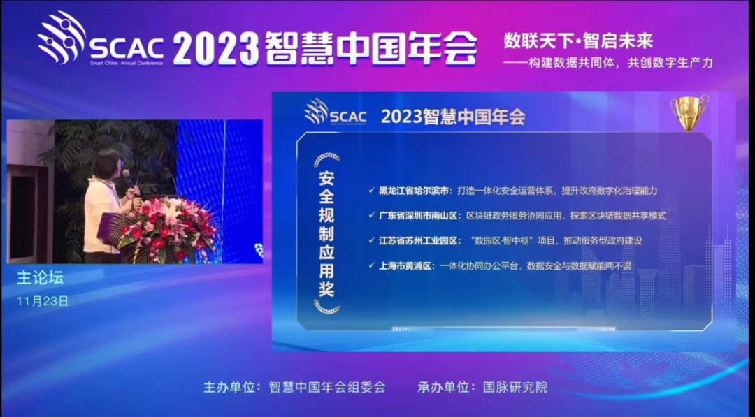 会上开展了2023(第五届)数字政府特色评选活动,安恒信息助力哈尔滨市大数据中心落地的“打造一体化安全运营体系,提升政府数字化治理能力”案例荣获“安全规制应用奖”。